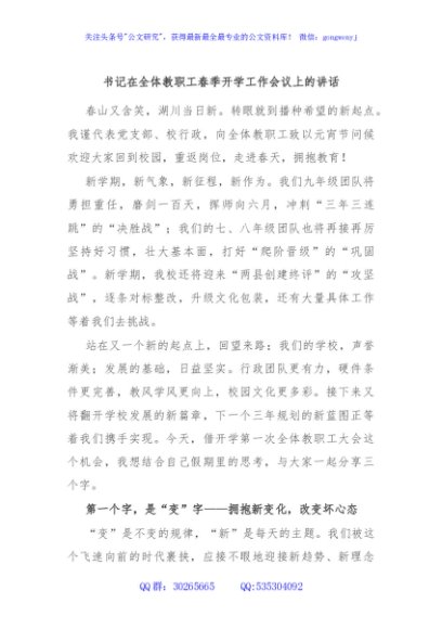 / 书记在全体教职工春季开学工作会议上的讲话