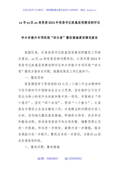 / xx市xx区xx局党委2024年党委书记抓基层党建述职评议和乡村振兴专项巡视“回头看”整改措施落实情况报告