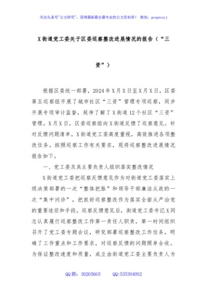 / X街道党工委关于区委巡察整改进展情况的报告(“三资”)