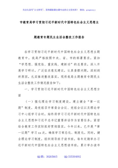 / 市教育局学习贯彻习近平新时代中国特色社会主义思想主题教育专题民主生活会整改工作报告