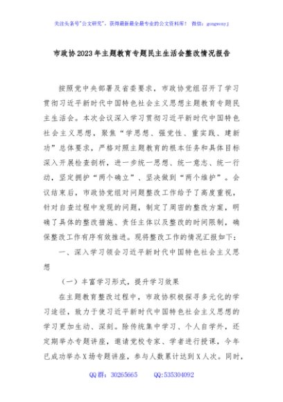 / 市政协2023年主题教育专题民主生活会整改情况报告