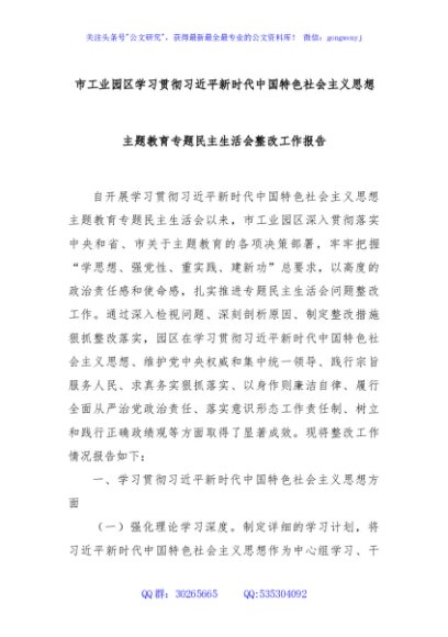 / 市工业园区学习贯彻习近平新时代中国特色社会主义思想主题教育专题民主生活会整改工作报告