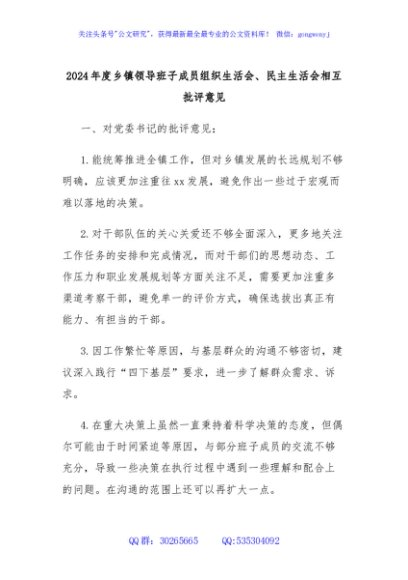 / 2024年度乡镇领导班子成员组织生活会、民主生活会相互批评意见