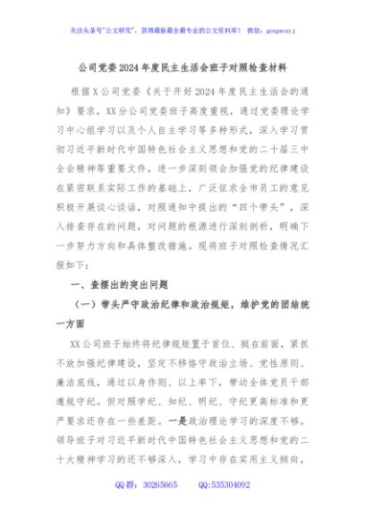 / 公司党委2024年度民主生活会班子对照检查材料