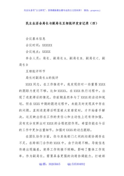 / 民主生活会局长与副局长互相批评发言记录(四)