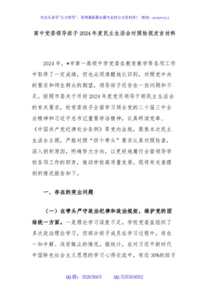 / 高中党委领导班子2024年度民主生活会对照检视发言材料