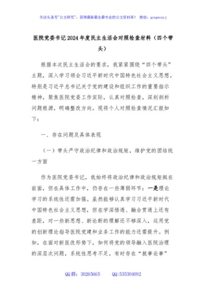 / 医院党委书记2024年度民主生活会对照检查材料(四个带头)