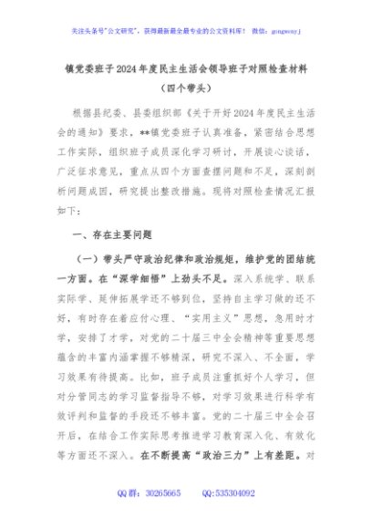 / 镇党委班子2024年度民主生活会领导班子对照检查材料(四个带头)