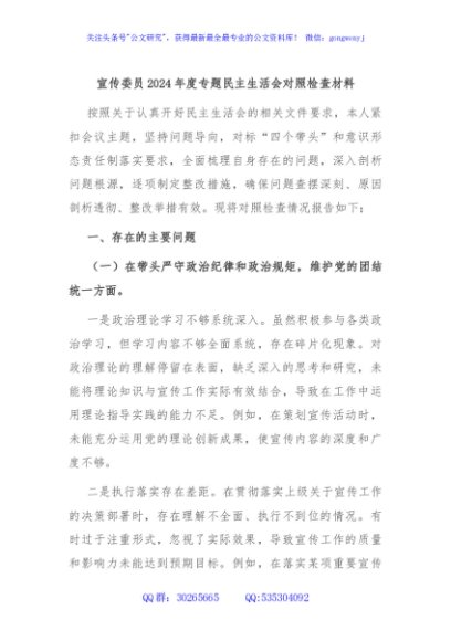 / 宣传委员2024年度专题民主生活会对照检查材料