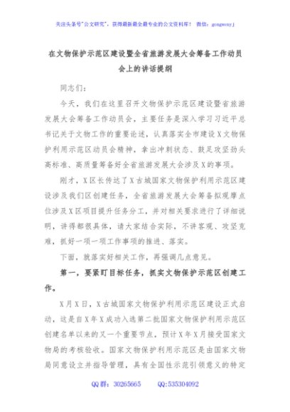 / 在文物保护示范区建设暨全省旅游发展大会筹备工作动员会上的讲话提纲