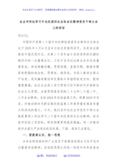 / 在全市传达学习中央纪委四次全体会议精神党员干部大会上的讲话