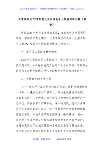 / 局党组书记2024年度民主生活会个人检视剖析材料(城管)