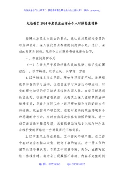 / 纪检委员2024年度民主生活会个人对照检查材料