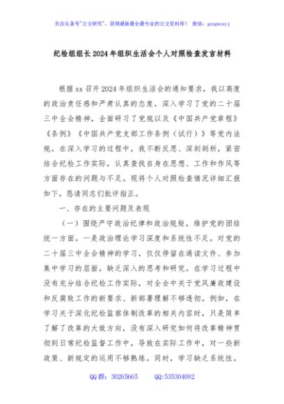 / 纪检组组长2024年组织生活会个人对照检查发言材料
