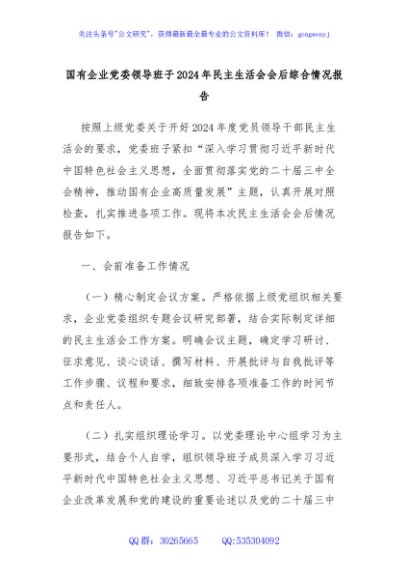/ 国有企业党委领导班子2024年民主生活会会后综合情况报告