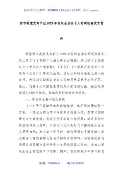 / 团市委党支部书记2024年组织生活会个人对照检查发言材料