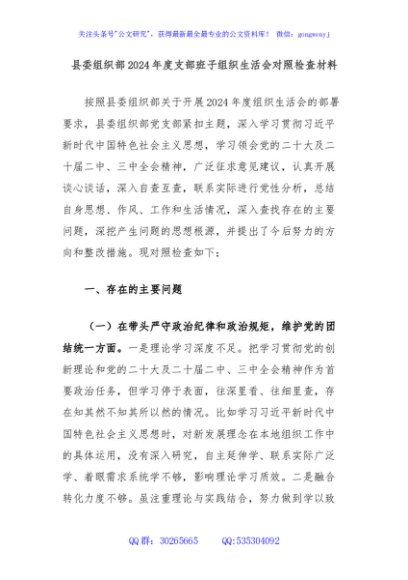 / 县委组织部2024年度支部班子组织生活会对照检查材料