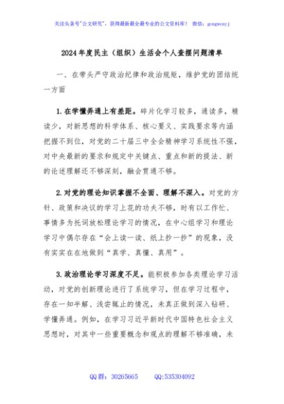 / 2024年度民主(组织)生活会个人查摆问题清单