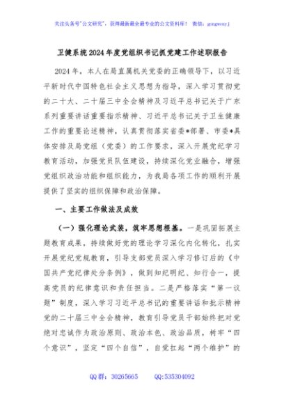 / 卫健系统2024年度党组织书记抓党建工作述职报告