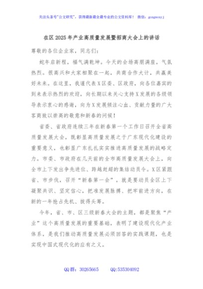 / 在区2025年产业高质量发展暨招商大会上的讲话