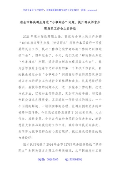 / 在全市解决群众身边“小事难办”问题、提升群众诉求办理质效工作会上的讲话