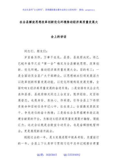/ 在全县解放思想改革创新优化环境推动经济高质量发展大会上的讲话
