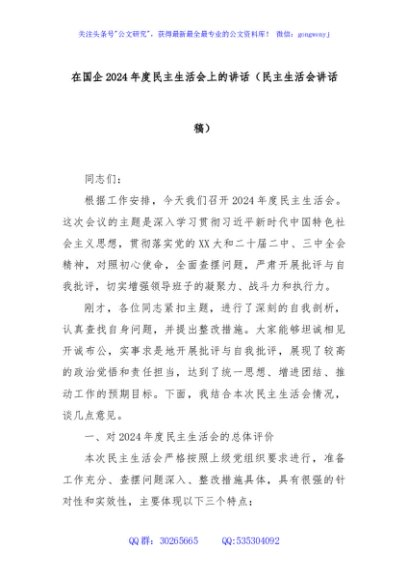 / 在国企2024年度民主生活会上的讲话(民主生活会讲话稿)