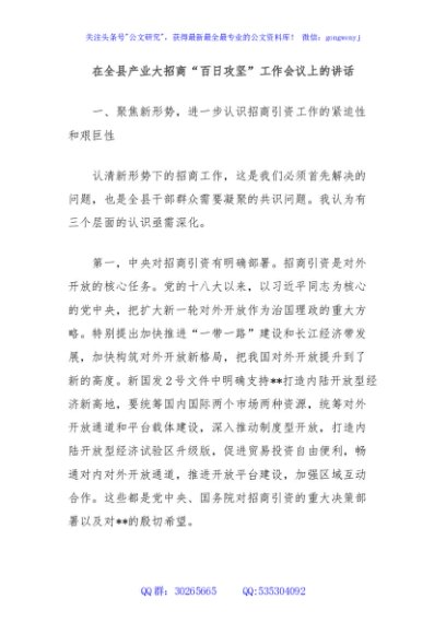 / 在全县产业大招商“百日攻坚”工作会议上的讲话