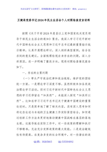 / 卫健局党委书记2024年民主生活会个人对照检查发言材料