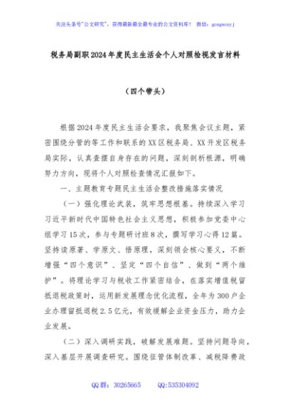 / 税务局副职2024年度民主生活会个人对照检视发言材料(四个带头)