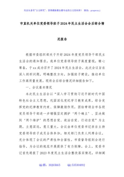 / 市直机关单位党委领导班子2024年民主生活会会后综合情况报告