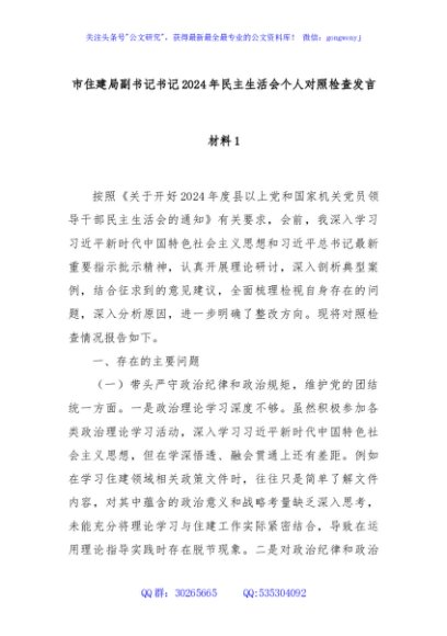 / 市住建局副书记书记2024年民主生活会个人对照检查发言材料1