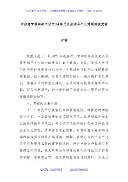 / 市应急管理局副书记2024年民主生活会个人对照检查发言材料