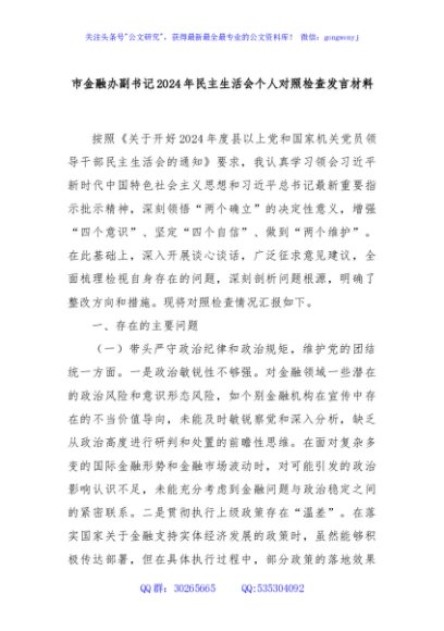 / 市金融办副书记2024年民主生活会个人对照检查发言材料