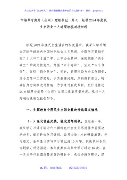 / 市烟草专卖局(公司)党组书记、局长、经理2024年度民主生活会个人对照检视剖析材料