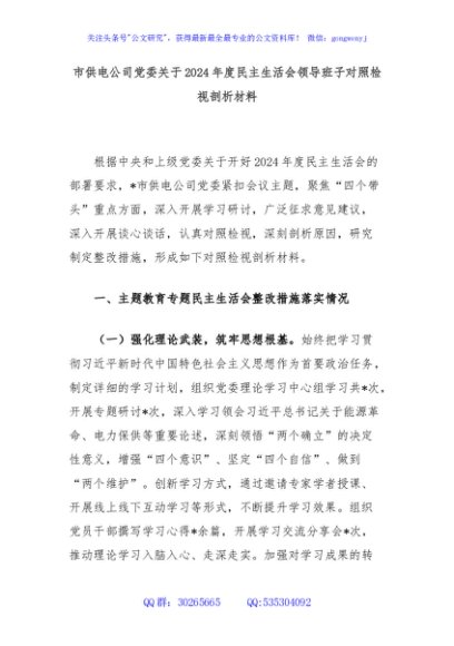 / 市供电公司党委关于2024年度民主生活会领导班子对照检视剖析材料