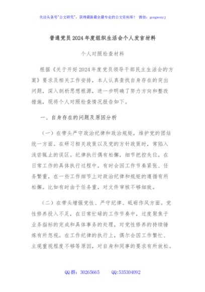 / 普通党员2024年度组织生活会个人发言材料
