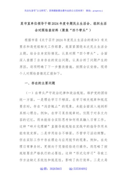 / 某市直单位领导干部2024年度专题民主生活会、组织生活会对照检查材料(聚焦“四个带头”)