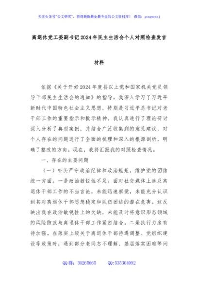 / 离退休党工委副书记2024年民主生活会个人对照检查发言材料