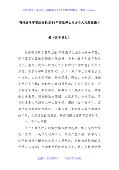 / 街道应急管理所所长2024年度组织生活会个人对照检查材料(四个带头)