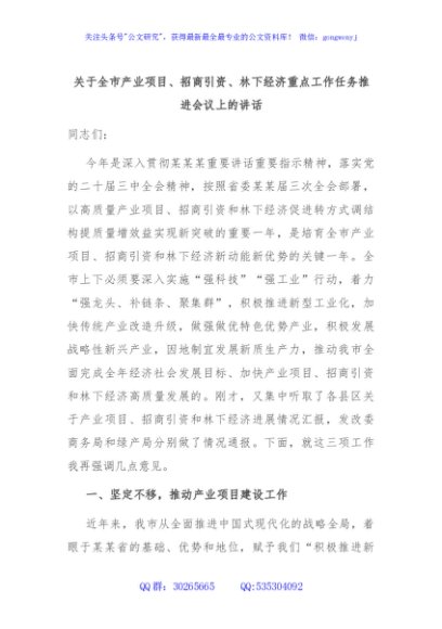 / 关于全市产业项目、招商引资、林下经济重点工作任务推进会议上的讲话