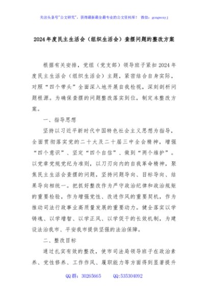 / 2024年度民主生活会(组织生活会)查摆问题的整改方案