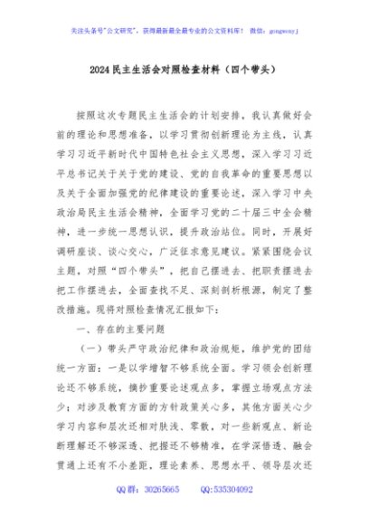 2024年度民主生活会个人发言提纲(生活会整改+四个带头+典型案例)