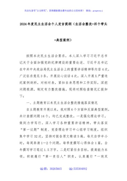 / 2024年度民主生活会个人发言提纲(生活会整改+四个带头+典型案例)