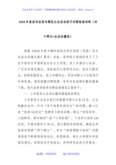 / 2024年度县司法局专题民主生活会班子对照检查材料(四个带头+生活会整改)