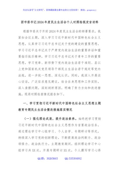 / 团市委书记2024年度民主生活会个人对照检视发言材料