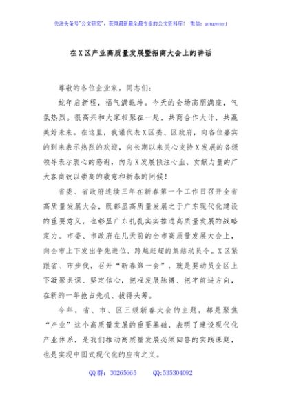 / 在X区产业高质量发展暨招商大会上的讲话
