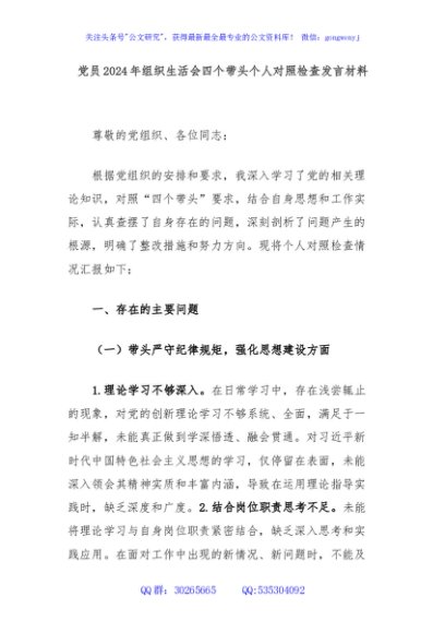 / 党员2024年组织生活会四个带头个人对照检查发言材料
