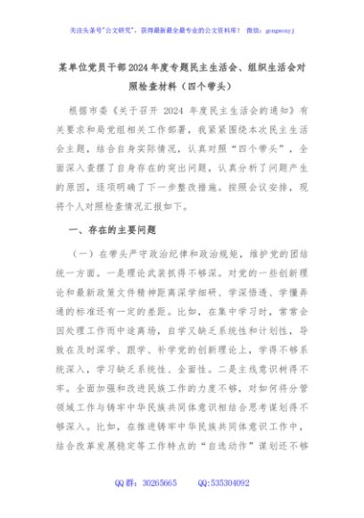 / 某单位党员干部2024年度专题民主生活会、组织生活会对照检查材料(四个带头)