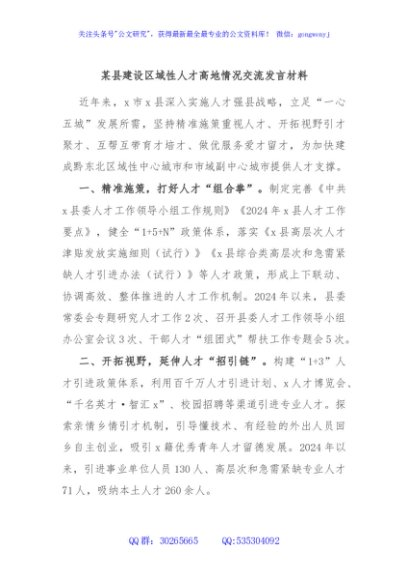 / 某县建设区域性人才高地情况交流发言材料